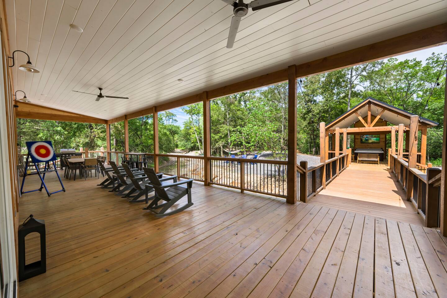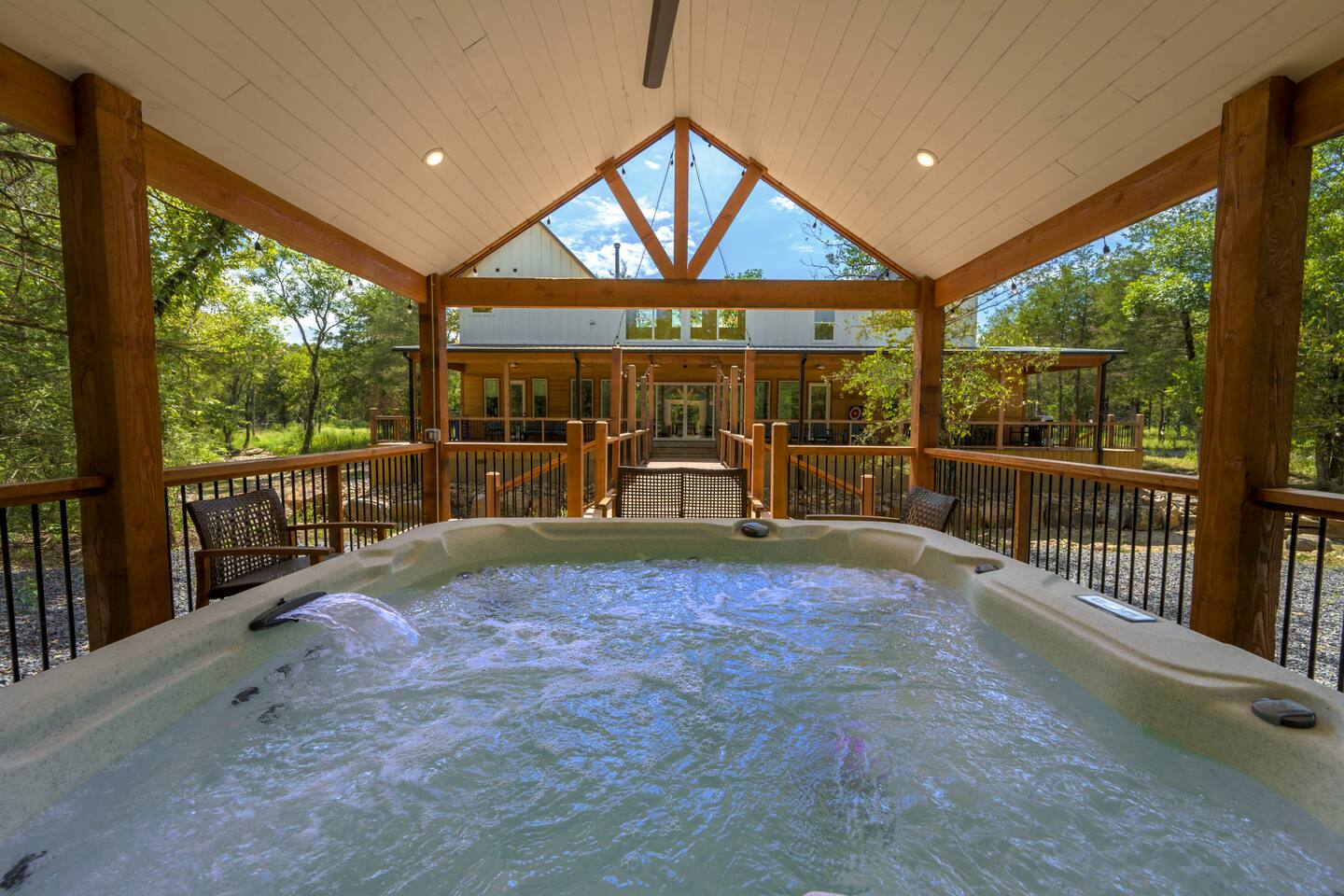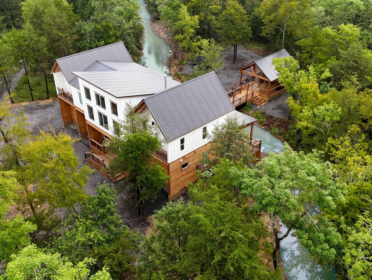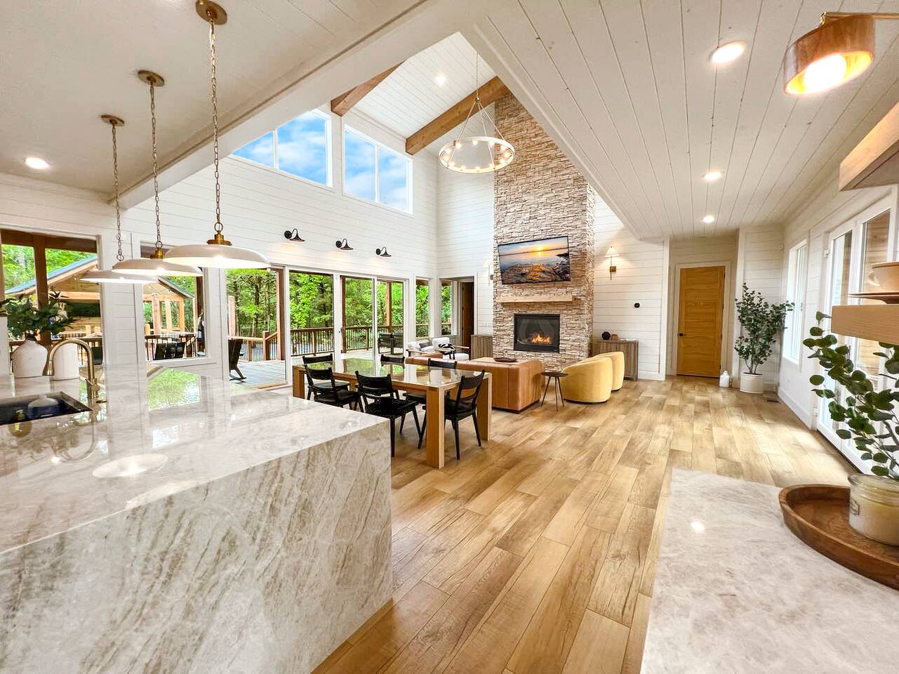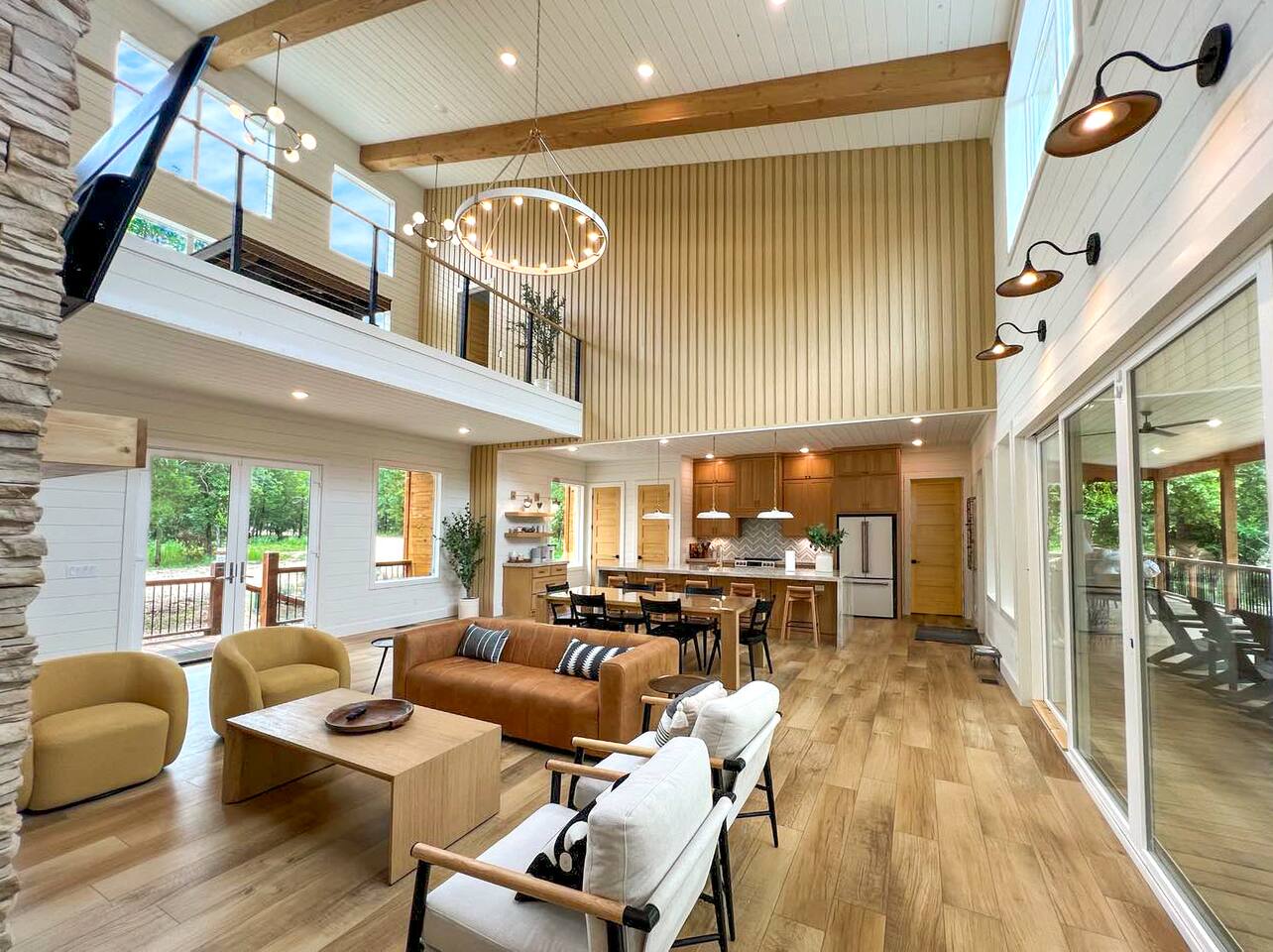 Step inside The Bridge of Wonders and experience a spacious, modern interior designed for comfort and relaxation, with luxurious finishes, open living areas, and thoughtful touches that make it perfect for families and groups alike. Experience a Truly Unique Landscape Nestled by a boulder-lined creek, The Bridge of Wonders offers an enchanting escape where soothing water sounds and breathtaking views set the scene for a serene getaway. The iconic bridge adds charm and access to an expansive back deck, creating a private oasis that feels like your own nature reserve. Sleeping Arrangements • Master Bedroom 1: Full king bed, ensuite bathroom, private access to deck. • Master Bedroom 2: Full king bed, ensuite bathroom, private access to deck. • Master Bedroom 3: Full king bed, ensuite bathroom, access to private balcony. • Bedroom 4: Queen bed with access to private balcony. • Bedroom 5: Bunk room with 4 single beds • Large playroom: Optional queen sofa bed and foldable queen mattress. ** Additional sleeping options are available. If you have specific needs, please reach out, and we’ll do our best to accommodate. Luxury Meets Comfort Step inside and be wowed by the open-concept living area featuring floor-to-ceiling windows, a plush leather sofa, and a cozy gas fireplace with a striking rock chimney. Relax and entertain with a 75-inch Smart TV. The gourmet kitchen is a culinary dream with high-end Café appliances, a 12 ft quartzite waterfall island, and a dining area for 8 plus additional seating for 5 on the kitchen island stools. Entertainment for All Ages The Bridge of Wonders is packed with entertainment for everyone. The game loft upstairs boasts a pool table and shuffleboard, while the playroom offers an arcade machine, a 75-inch TV, and a cozy space for kids with an adjacent enclosed bunk room. Outdoor Paradise Step out to the 2,200 sq ft covered patio, complete with multiple seating areas, a propane grill, and an outdoor bar. Cross the bridge to the oversized gazebo featuring a 6-person hot tub and a 65-inch Smart TV. Enjoy the fire pit, Adirondack chairs, and a variety of games like corn hole and life-sized Connect 4. Take a tranquil stroll along the creek or relax in the hammocks. Elegant Sleeping Quarters Five beautifully appointed bedrooms ensure restful nights, including three king suites with luxurious ensuite and private patios, a queen bedroom with a private patio, and a fun bunk room for kids. The playroom also offers two convertible couches for extra guests, as well as a foldable floor mattress. Convenient Amenities The Bridge of Wonders includes two laundry rooms, high-speed internet, and ample parking for up to 10 vehicles. For special events like weddings and family reunions, enjoy complimentary planning services. Optional Services Enhance your stay with special requests, concierge grocery service, in-cabin chef, or massages. Prime Location Just 5 minutes from Hochatown’s attractions and a short drive to Broken Bow Lake and Beavers Bend State Park for kayaking, hiking, and zip-lining.