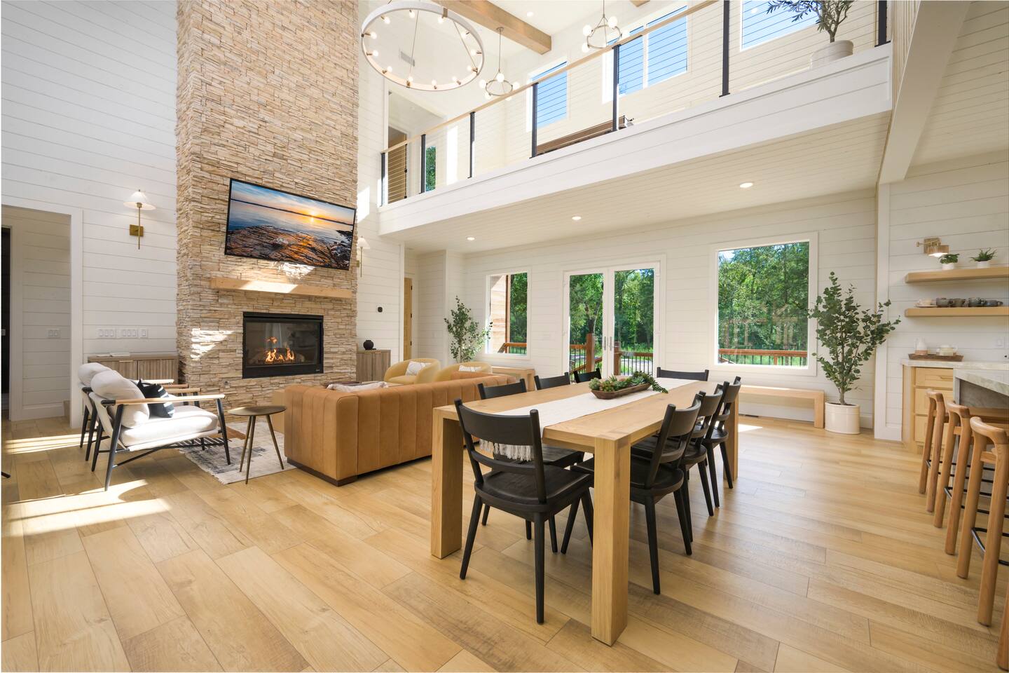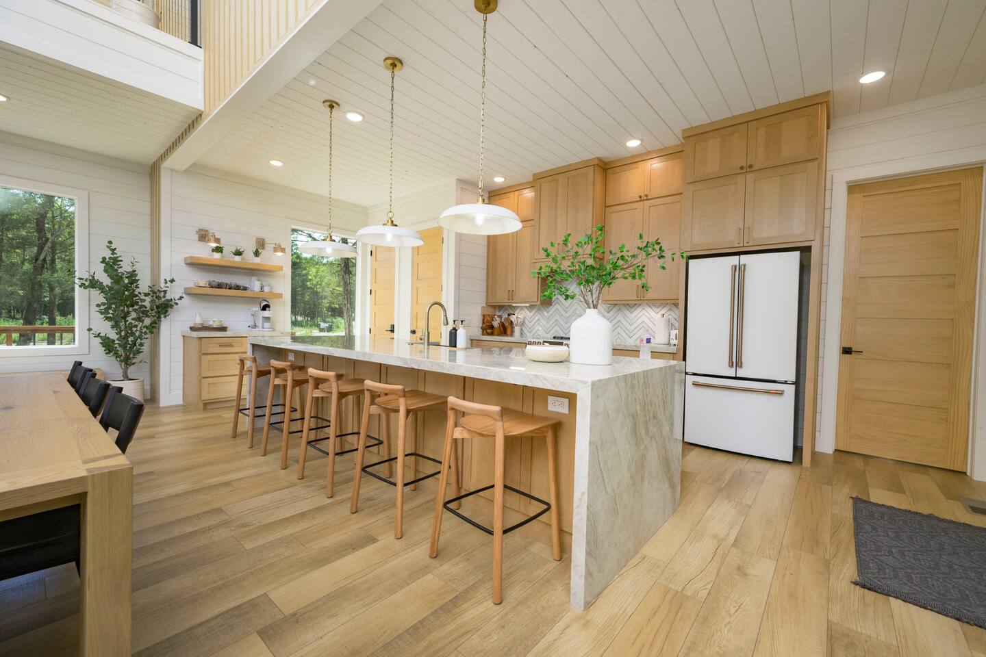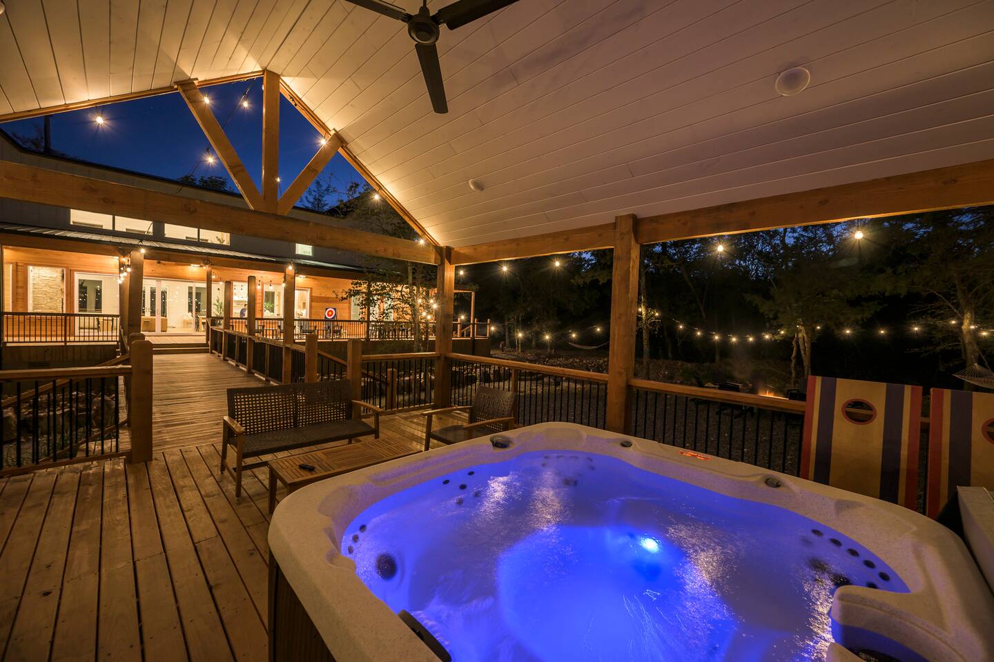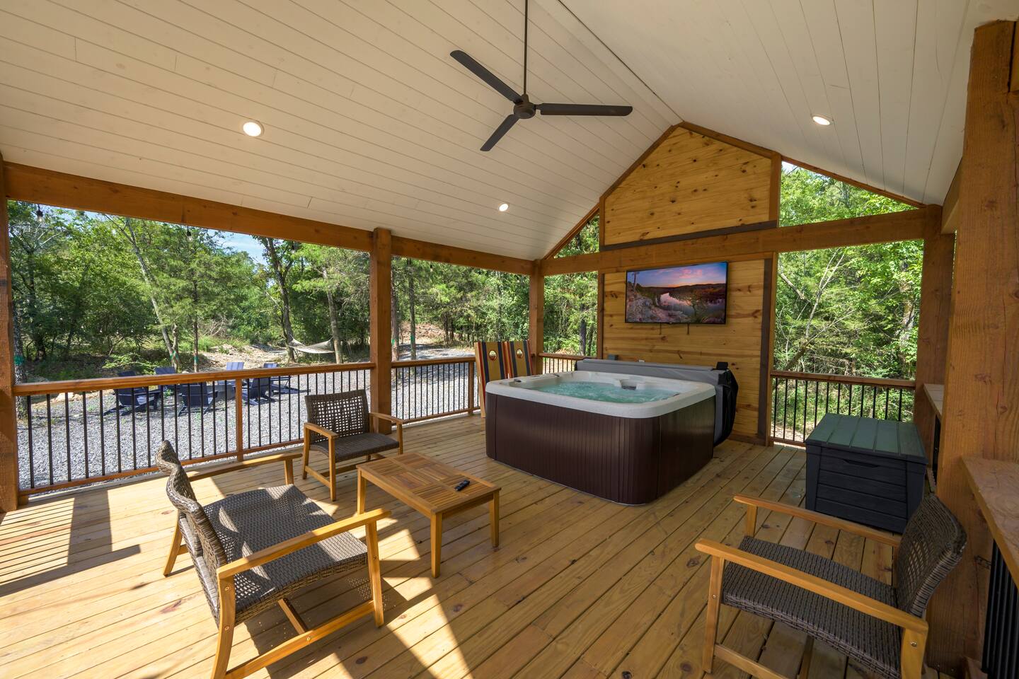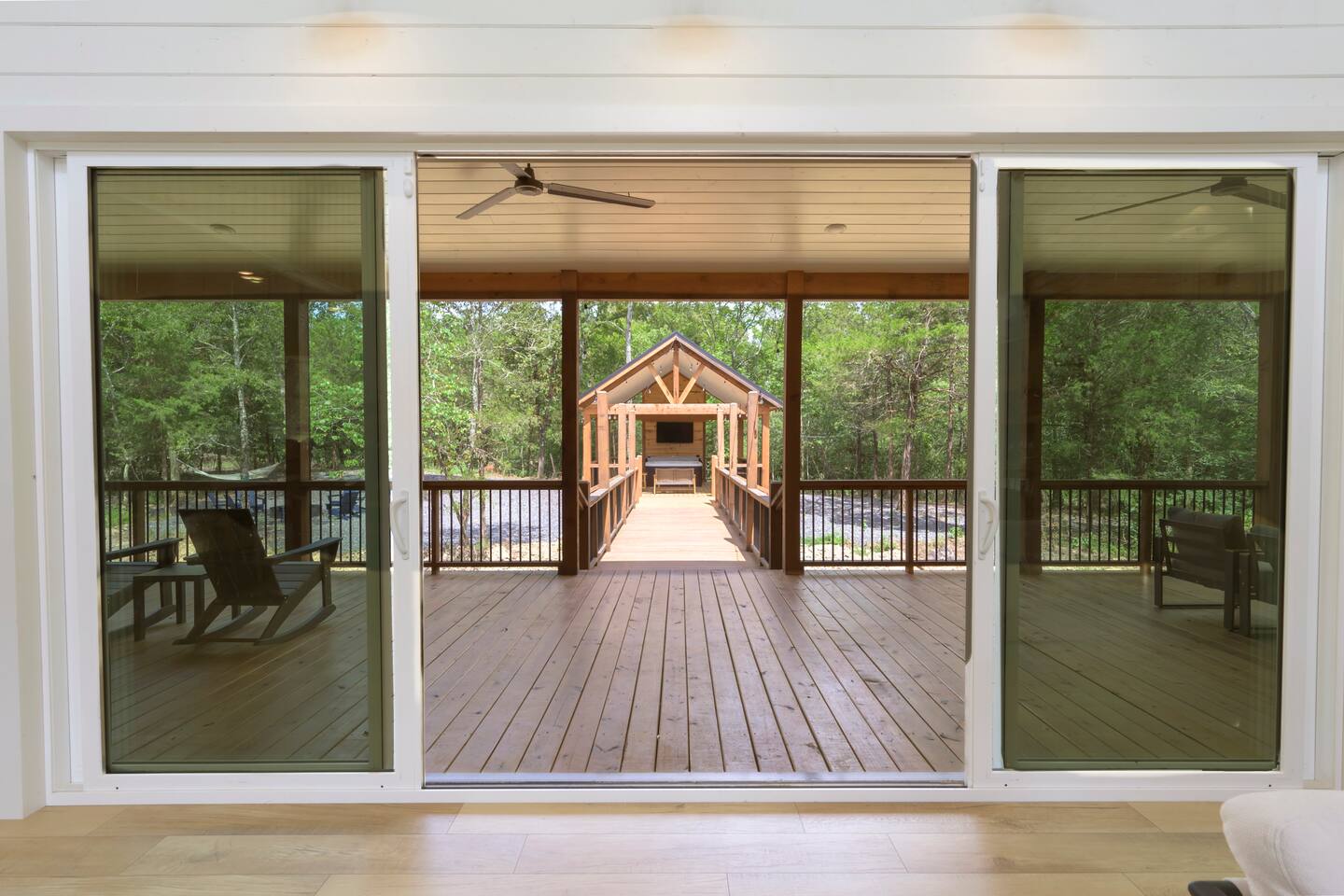 Step inside The Bridge of Wonders and experience a spacious, modern interior designed for comfort and relaxation, with luxurious finishes, open living areas, and thoughtful touches that make it perfect for families and groups alike. Experience a Truly Unique Landscape Nestled by a boulder-lined creek, The Bridge of Wonders offers an enchanting escape where soothing water sounds and breathtaking views set the scene for a serene getaway. The iconic bridge adds charm and access to an expansive back deck, creating a private oasis that feels like your own nature reserve. Sleeping Arrangements • Master Bedroom 1: Full king bed, ensuite bathroom, private access to deck. • Master Bedroom 2: Full king bed, ensuite bathroom, private access to deck. • Master Bedroom 3: Full king bed, ensuite bathroom, access to private balcony. • Bedroom 4: Queen bed with access to private balcony. • Bedroom 5: Bunk room with 4 single beds • Large playroom: Optional queen sofa bed and foldable queen mattress. ** Additional sleeping options are available. If you have specific needs, please reach out, and we’ll do our best to accommodate. Luxury Meets Comfort Step inside and be wowed by the open-concept living area featuring floor-to-ceiling windows, a plush leather sofa, and a cozy gas fireplace with a striking rock chimney. Relax and entertain with a 75-inch Smart TV. The gourmet kitchen is a culinary dream with high-end Café appliances, a 12 ft quartzite waterfall island, and a dining area for 8 plus additional seating for 5 on the kitchen island stools. Entertainment for All Ages The Bridge of Wonders is packed with entertainment for everyone. The game loft upstairs boasts a pool table and shuffleboard, while the playroom offers an arcade machine, a 75-inch TV, and a cozy space for kids with an adjacent enclosed bunk room. Outdoor Paradise Step out to the 2,200 sq ft covered patio, complete with multiple seating areas, a propane grill, and an outdoor bar. Cross the bridge to the oversized gazebo featuring a 6-person hot tub and a 65-inch Smart TV. Enjoy the fire pit, Adirondack chairs, and a variety of games like corn hole and life-sized Connect 4. Take a tranquil stroll along the creek or relax in the hammocks. Elegant Sleeping Quarters Five beautifully appointed bedrooms ensure restful nights, including three king suites with luxurious ensuite and private patios, a queen bedroom with a private patio, and a fun bunk room for kids. The playroom also offers two convertible couches for extra guests, as well as a foldable floor mattress. Convenient Amenities The Bridge of Wonders includes two laundry rooms, high-speed internet, and ample parking for up to 10 vehicles. For special events like weddings and family reunions, enjoy complimentary planning services. Optional Services Enhance your stay with special requests, concierge grocery service, in-cabin chef, or massages. Prime Location Just 5 minutes from Hochatown’s attractions and a short drive to Broken Bow Lake and Beavers Bend State Park for kayaking, hiking, and zip-lining.